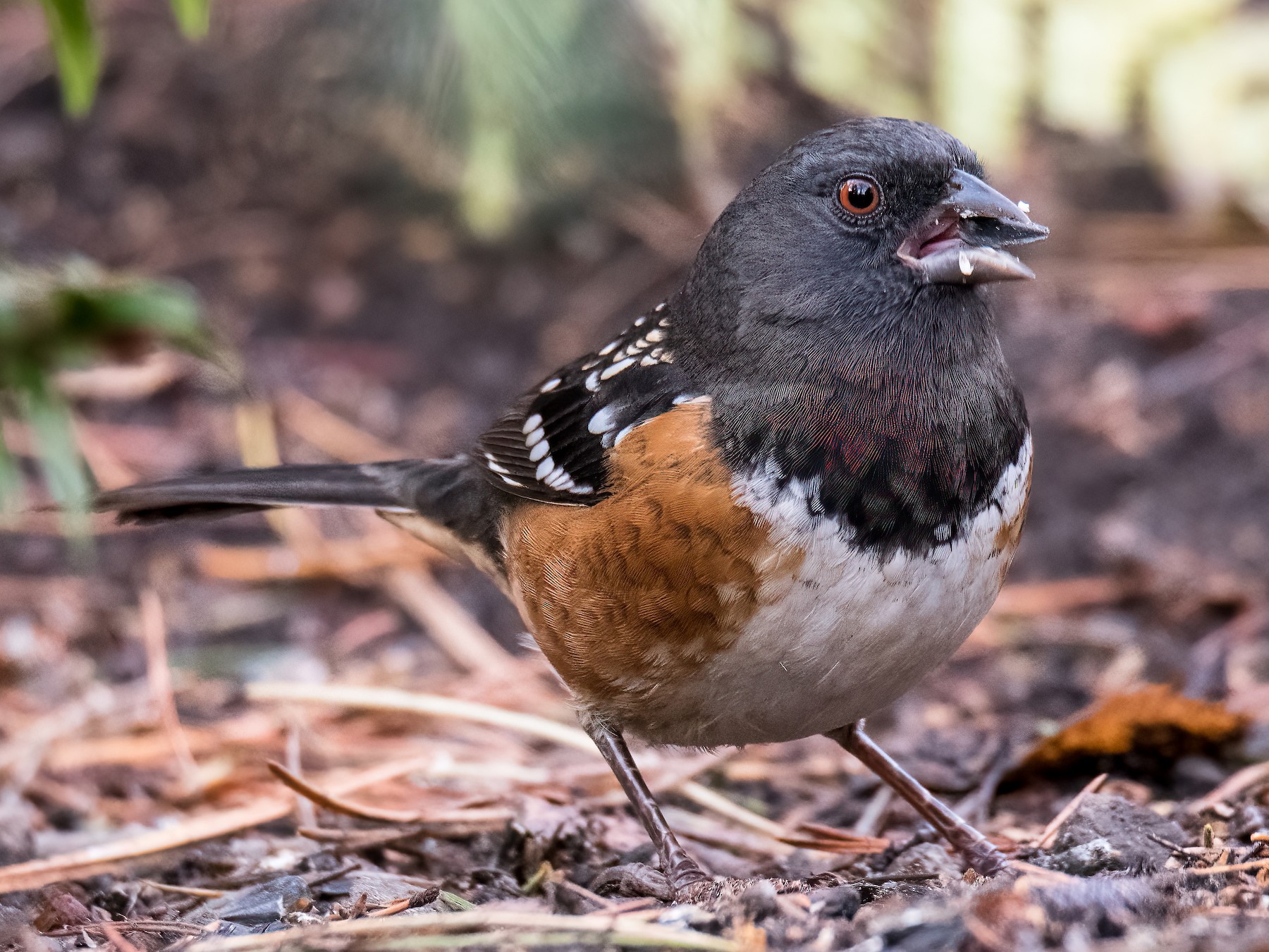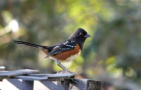 One of the distinguishing features of the spotted towhee is the white spotting splashed over its wings and back.